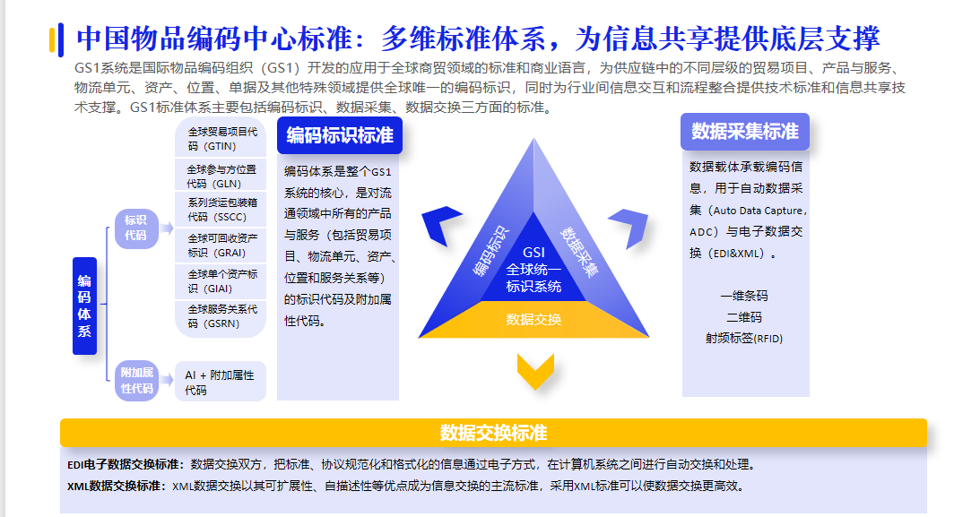 統(tǒng)一物品編碼標(biāo)準(zhǔn)一直是采購供應(yīng)鏈領(lǐng)域的重點和難點。中國物品編碼中心的GS1系統(tǒng)是國際物品編碼組織(GS1)開發(fā)的應(yīng)用于全球商貿(mào)領(lǐng)域的標(biāo)準(zhǔn)和商業(yè)語言,為供應(yīng)鏈中的不同層級的貿(mào)易項目、產(chǎn)品與服務(wù)、物流單元、資產(chǎn)、位置、單據(jù)及其他特殊領(lǐng)域提供全球唯一的編碼標(biāo)識,同時為行業(yè)間信息交互和流程整合提供技術(shù)標(biāo)準(zhǔn)和信息共享技術(shù)支撐。
