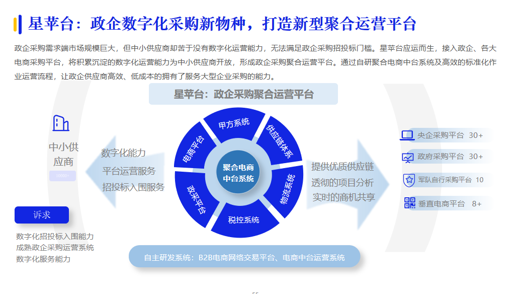 業(yè)務(wù)+數(shù)據(jù)的雙中臺模式,也是今年技術(shù)服務(wù)商在中臺方面的創(chuàng)新看點。從業(yè)務(wù)系統(tǒng)獲取的信息經(jīng)過數(shù)據(jù)中臺的處理,再經(jīng)過業(yè)務(wù)中臺的分析后,為企業(yè)提供智能決策支持。例如,星蘋臺通過自研聚合電商中臺系統(tǒng),接入政企、各大電商采購平臺,將積累沉淀的數(shù)字化運營能力為中小供應(yīng)商開放,讓其擁有了服務(wù)大型企業(yè)采購的能力。