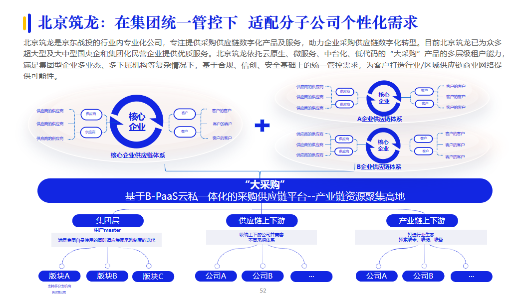 針對企業(yè)既要滿足標(biāo)準(zhǔn)化,又要滿足定制化業(yè)務(wù)需求,PaaS提供的服務(wù)更具有拓展性、集中性、適配性更強。北京筑龍基于多租戶體系,構(gòu)建了大采購云私一體化B-PaaS平臺,既滿足多層級集中管理管控需求,又為下屬管理及執(zhí)行機構(gòu)提供更多個性化、自主性選擇,進而適應(yīng)集團多元化和業(yè)務(wù)單元專業(yè)化發(fā)展。