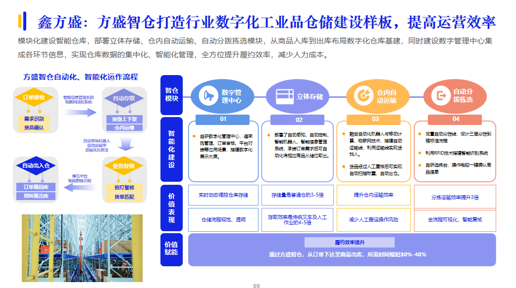 履約能力是供應(yīng)商的核心競爭力。在履約服務(wù)方面,為了提高履約交付效率,供應(yīng)商加大AI等技術(shù)投入應(yīng)用,建設(shè)智能倉儲、智慧物流等數(shù)智供應(yīng)鏈體系。例如,鑫方盛的方盛智倉打造行業(yè)數(shù)字化工業(yè)品倉儲建設(shè)樣板,實現(xiàn)倉庫數(shù)據(jù)的集中化、智能化管理,全方位提升履約效率,減少人力成本。
