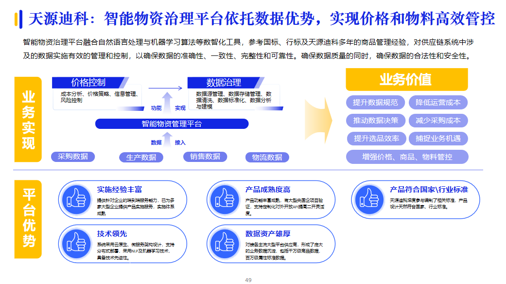 部分央國企會根據(jù)企業(yè)自身的數(shù)字化薄弱點,采取有針對性地補齊斷點的實施策略,包括供建立應(yīng)商協(xié)同管理系統(tǒng)、優(yōu)化物資分類與編碼設(shè)計、建立供應(yīng)商管理體系、建設(shè)電商采購平臺、設(shè)計倉儲管理體系等內(nèi)容。例如:天源迪科在智能物資治理方面,提出了價格和物料高效管控的解決方案,有效確保價格數(shù)據(jù)的合法性和安全性。