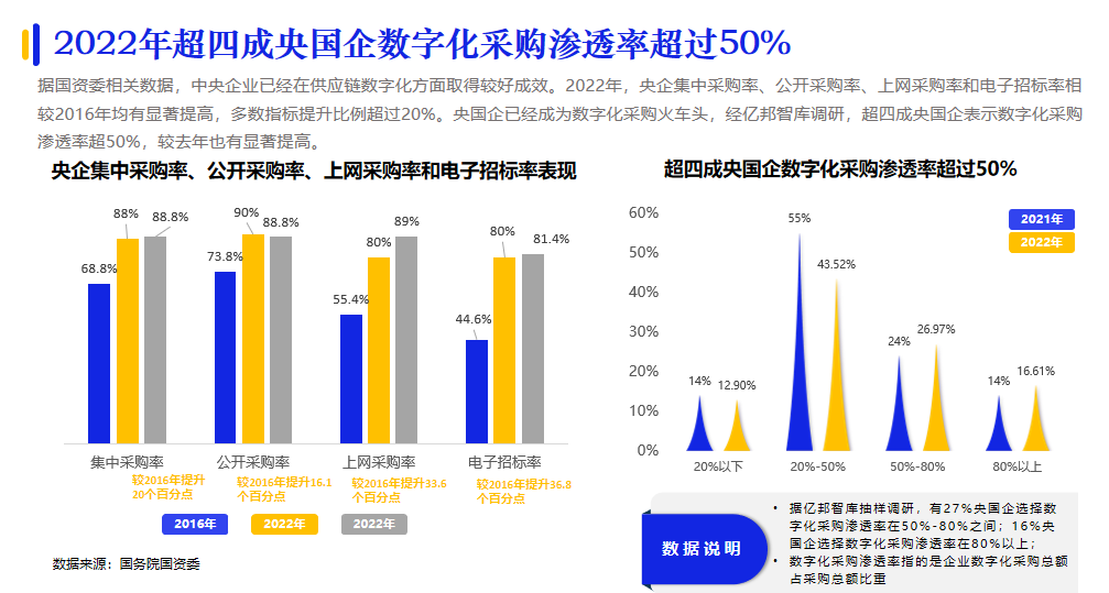 央國企在我國企業(yè)采購數(shù)字化進程中的火車頭效應(yīng)越發(fā)明顯。據(jù)億邦智庫調(diào)研,超四成央國企表示數(shù)字化采購滲透率已經(jīng)超過50%;形成了央國企先行,引發(fā)供應(yīng)鏈各環(huán)節(jié)企業(yè)參與數(shù)字化創(chuàng)新變革的發(fā)展態(tài)勢。