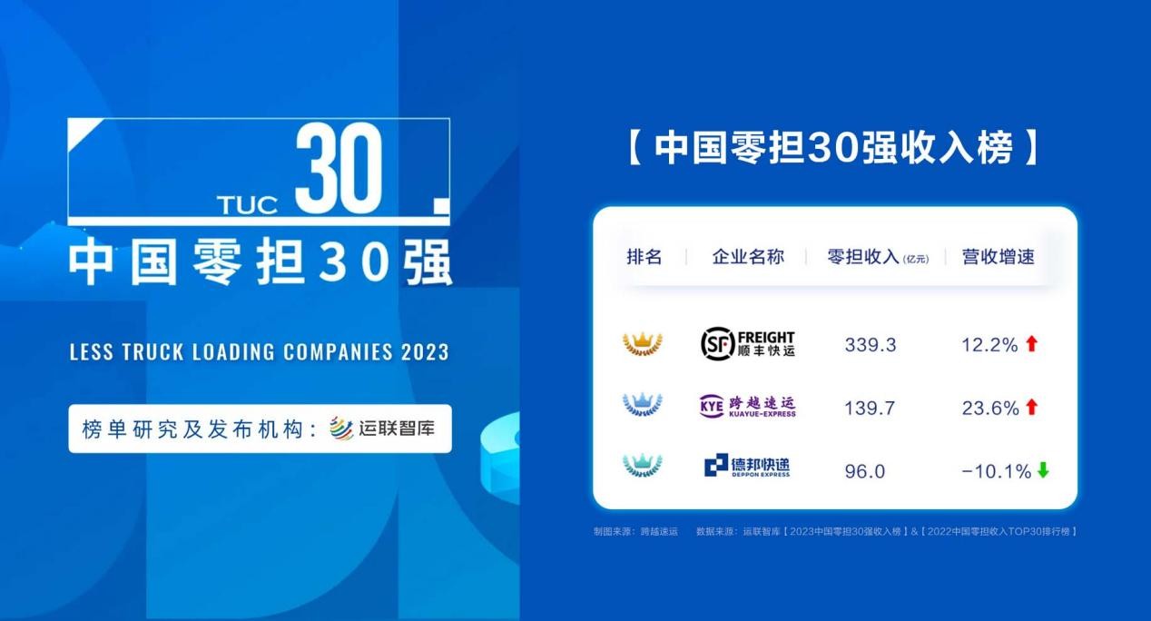 但,過(guò)去的16年時(shí)間里,就在大家認(rèn)為快遞領(lǐng)域的競(jìng)爭(zhēng)進(jìn)入白熱化階段的時(shí)候,跨越卻加速崛起“后來(lái)居上”。8月9日,運(yùn)聯(lián)智庫(kù)頒布2023中國(guó)零擔(dān)排行榜,跨越以139.7億總營(yíng)收蟬聯(lián)榜單第二名(第一是順豐,第三是德邦),營(yíng)收增速逆勢(shì)提升到23.6%,領(lǐng)跑榜單三甲企業(yè)(順豐12.2%,德邦-10.1%)。