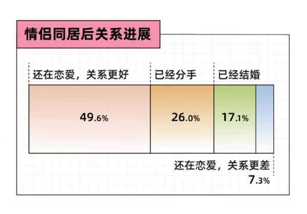 “同居分離會產(chǎn)生焦慮癥嗎”“試婚同居生子男方棄養(yǎng)”“同居該不該AA”……微博熱搜榜上,同居始終是一大熱門爭議話題。當(dāng)熱戀期的完美形象分崩離析,留給同居的年輕人的,是否只是一地雞毛?實際上,《報告》顯示,多數(shù)同居關(guān)系有著美好結(jié)局。