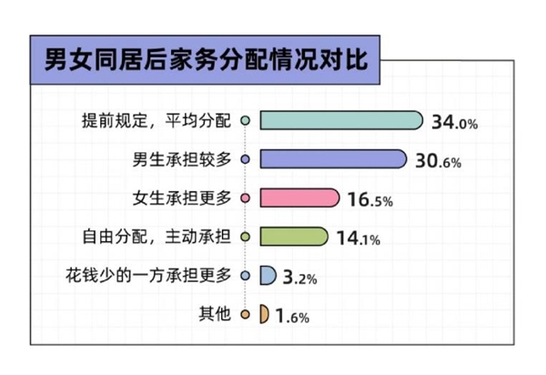 令人意外的是,《報告》顯示,“男生承擔(dān)更多家務(wù)”的比例為30.6%,高于女生(16.5%),完全顛覆了刻板認(rèn)知。此前的一項調(diào)查也顯示,同居后,男生們的“居家能力”大幅提升,提升幅度甚至超過女生,不過在結(jié)婚后又會有所下降。