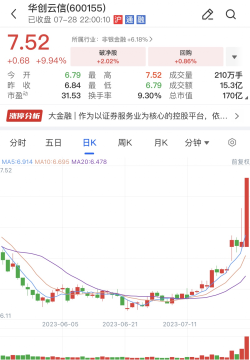 作為太平洋證券7.44億股股權(quán)的收購方,華創(chuàng)證券母公司華創(chuàng)云信(原華創(chuàng)陽安)同樣出現(xiàn)大漲,截至28日收盤,日內(nèi)成交15.28億元,換手率為9.3%,買一封單為9.23萬手,近4個交易日累計上漲14.81%,最新市值為170.06億元。