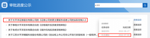 證監(jiān)會政務(wù)服務(wù)平臺顯示,太平洋證券主要股東或者公司的實控人變更仍處于補正通知狀態(tài),該狀態(tài)的完成日期為“2022-07-04”,接收材料時間為“2022-06-27”。