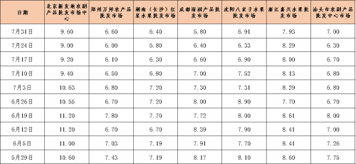 從全國(guó)來(lái)看,當(dāng)前國(guó)內(nèi)夏季水果供應(yīng)較為充足,近期國(guó)內(nèi)水果交易價(jià)格整體處于較低水平,本期農(nóng)業(yè)農(nóng)村部監(jiān)測(cè)的6種重點(diǎn)監(jiān)測(cè)水果價(jià)格跌幅收窄。截至7月31日,農(nóng)業(yè)農(nóng)村部監(jiān)測(cè)的6種水果(富士蘋(píng)果、巨峰葡萄、香蕉、菠蘿、西瓜、鴨梨)批發(fā)均價(jià)報(bào)7.35元/公斤,較7月24日下跌0.94%。