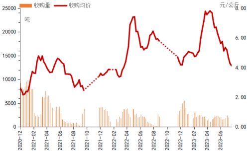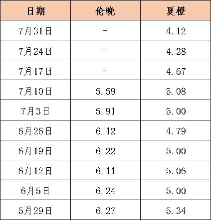 在產(chǎn)地收購(gòu)方面,截至7月27日,秭歸夏橙已銷(xiāo)售本產(chǎn)季產(chǎn)量的59.38%,走貨速度整體低于去年同期。受降雨天氣影響,貿(mào)易商采購(gòu)意愿減弱,夏橙收購(gòu)價(jià)格及收購(gòu)量下降。本期秭歸夏橙收購(gòu)量環(huán)比下跌17.49%。價(jià)格方面,本期夏橙收購(gòu)價(jià)格報(bào)4.12元/公斤,環(huán)比下跌3.69%,同比下跌34.10%。