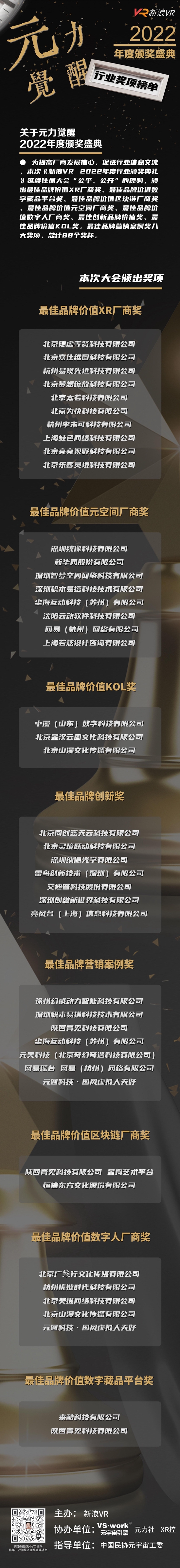 為提高廠商發(fā)展信心,促進(jìn)行業(yè)信息交流,本次《新浪VR 2022年度行業(yè)頒獎(jiǎng)典禮》延續(xù)往屆大會(huì)“公平、公開”的原則,頒出最佳品牌價(jià)值XR廠商獎(jiǎng)、最佳品牌價(jià)值數(shù)字藏品平臺(tái)獎(jiǎng)、最佳品牌價(jià)值區(qū)塊鏈廠商獎(jiǎng)、最佳品牌價(jià)值元空間廠商獎(jiǎng)、最佳品牌價(jià)值數(shù)字人廠商獎(jiǎng)、最佳創(chuàng)新品牌價(jià)值獎(jiǎng)、最佳品牌價(jià)值KOL獎(jiǎng),最佳品牌營銷案例獎(jiǎng)八大獎(jiǎng)項(xiàng),總計(jì)44個(gè)數(shù)字獎(jiǎng)杯。