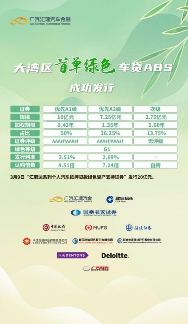 與此同時(shí),廣汽匯理良好的綠色金融資產(chǎn)也獲得了資本市場(chǎng)的認(rèn)可。今年3月9日,廣汽匯理發(fā)行了粵港澳大灣區(qū)首單綠色車貸ABS——匯聚達(dá)2023年第一期個(gè)人汽車抵押貸款綠色資產(chǎn)支持證券。本次入池資產(chǎn)均為廣汽埃安品牌新能源汽車個(gè)人貸款,經(jīng)綠色認(rèn)證機(jī)構(gòu)聯(lián)合赤道評(píng)估分析,入池資產(chǎn)對(duì)應(yīng)的新能源汽車,預(yù)計(jì)每年可實(shí)現(xiàn)二氧化碳減排6.07萬(wàn)噸,節(jié)約標(biāo)準(zhǔn)煤2.85萬(wàn)噸,有效地助力了我國(guó)節(jié)能減排事業(yè)開(kāi)展。
