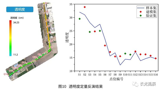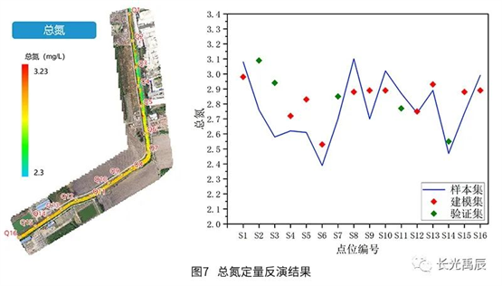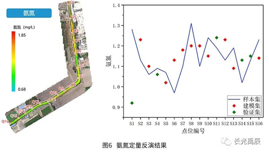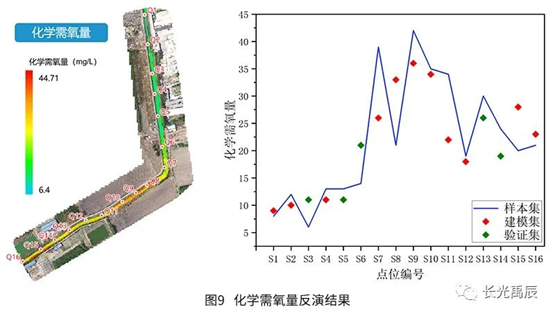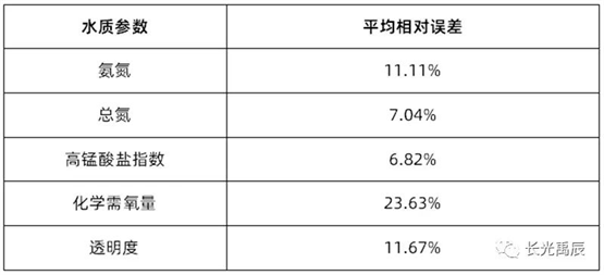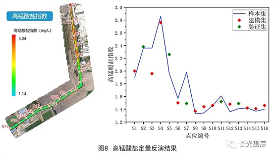 精度評(píng)定結(jié)果見表2.各水質(zhì)參數(shù)的平均相對(duì)誤差均在25%以下,可滿足常態(tài)化、高頻次的全局水質(zhì)檢測(cè)需求。化學(xué)需氧量反演誤差稍大是因?yàn)樵摋l河道整體水質(zhì)情況存在較大的空間異質(zhì)性,河道不同河段中有機(jī)物含量差異較大,而水體化學(xué)需氧量與有機(jī)物濃度密切相關(guān),所以這種變化較快的梯度可能會(huì)引入一定的誤差,模型也有繼續(xù)優(yōu)化的空間。