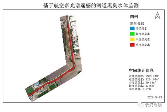 黑臭水體是指水質(zhì)污染嚴(yán)重、水體顏色異常、散發(fā)惡臭的情況。它通常由生活污水、工業(yè)廢水和農(nóng)業(yè)排放物等引起,造成環(huán)境破壞和健康風(fēng)險(xiǎn)。通過無(wú)人機(jī)多光譜遙感技術(shù),結(jié)合水色與實(shí)測(cè)水質(zhì)參數(shù)數(shù)據(jù)的分析,對(duì)本次實(shí)驗(yàn)河道黑臭水污染的識(shí)別情況如圖5所示。