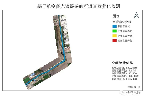 水體富營(yíng)養(yǎng)化是指水中營(yíng)養(yǎng)物質(zhì)(如氮、磷)過度積累,導(dǎo)致水體中藻類、水生植物大量繁殖的現(xiàn)象。水體富營(yíng)養(yǎng)化會(huì)造成藻類過度生長(zhǎng),破壞水生態(tài)系統(tǒng)的平衡,甚至引發(fā)水體死亡。通過無(wú)人機(jī)多光譜遙感技術(shù),結(jié)合實(shí)測(cè)水質(zhì)參數(shù)數(shù)據(jù)的分析,對(duì)本次實(shí)驗(yàn)河道水體富營(yíng)養(yǎng)化的識(shí)別情況如圖4所示。