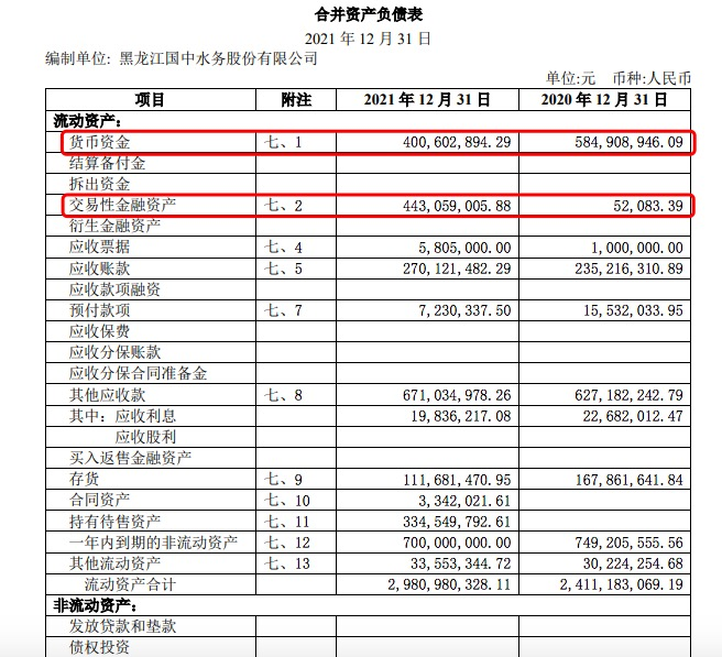 資金方面,截至2021年年末,國(guó)中水務(wù)流動(dòng)資產(chǎn)合計(jì)29.81億元,其中貨幣資金4.01億元,主要為銀行存款;交易性金融資產(chǎn)為4.43億元,主要為銀行理財(cái)產(chǎn)品。