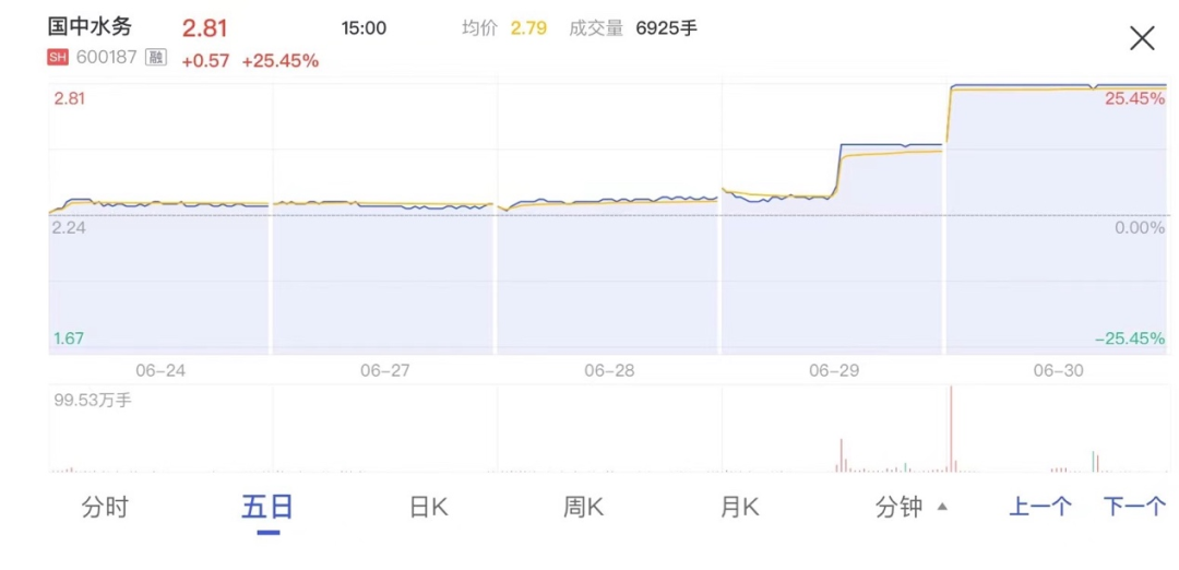 數(shù)據(jù)顯示,6月29日和30日,主營(yíng)業(yè)務(wù)為污水處理、自來(lái)水供應(yīng)和環(huán)保工程技術(shù)服務(wù)的國(guó)中水務(wù)股價(jià)連續(xù)兩日收于漲停,因有市場(chǎng)消息稱“公司未來(lái)可能通過(guò)重組注入?yún)R源果汁”。