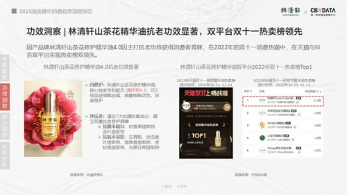 根據(jù)第一財經(jīng)商業(yè)數(shù)據(jù)中心的發(fā)布《2023油類精華消費趨勢洞察報告》 中指出,精華油、以油養(yǎng)膚,以及"抗老精華油"的概念在小紅書、抖音等社交平臺的搜索指數(shù)不斷攀升,小紅書上"以油養(yǎng)膚"話題的瀏覽總量超過了1.2億,過去一年線上淘寶天貓及京東平臺精華油銷售額同比增速達(dá)64%。在國內(nèi)外品牌紛紛跟進(jìn)推出油類護(hù)膚產(chǎn)品之際,林清軒憑借山茶花油的提前布局,借勢快速進(jìn)入爆發(fā)期。