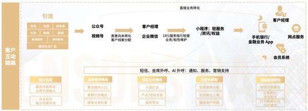 金融企業(yè)在客戶全鏈路互動與經(jīng)營上,涉及到的渠道觸點也比較多。通常,在引流階段,客戶通過交易型 App、資訊類 App、種草媒體等進行互動,之后進入公眾號、視頻號為主的公私域轉(zhuǎn)換的形態(tài),如果轉(zhuǎn)化周期較長,還會通過客戶經(jīng)理和企業(yè)微信進行 1V1 服務(wù)引導(dǎo)和關(guān)系維護,還可以直接導(dǎo)量到小程序或 H5 進行輕轉(zhuǎn)化,以及到手機銀行、金融業(yè)務(wù) App,結(jié)合客戶經(jīng)理、網(wǎng)點服務(wù)和會員系統(tǒng)加強后鏈路深度運營。