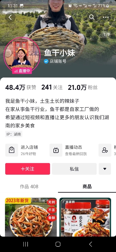 賀麗萍夫婦在抖音開了賬號(hào),取名“辣妹子田園美食”,主打的是小魚小蝦干等地方水特產(chǎn)。前期,他們沒有過多在這個(gè)賬號(hào)傾注心血,只是發(fā)些短視頻,流量也很一般。