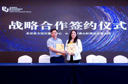 活動現(xiàn)場,北京北大寶石鑒定中心與北京真心紅珠寶有限公司還舉辦了現(xiàn)場簽約儀式,雙方將在珠寶鑒定、數(shù)字化溯源以及從業(yè)人員專業(yè)培訓(xùn)等多個(gè)版塊開展豐富的合作。