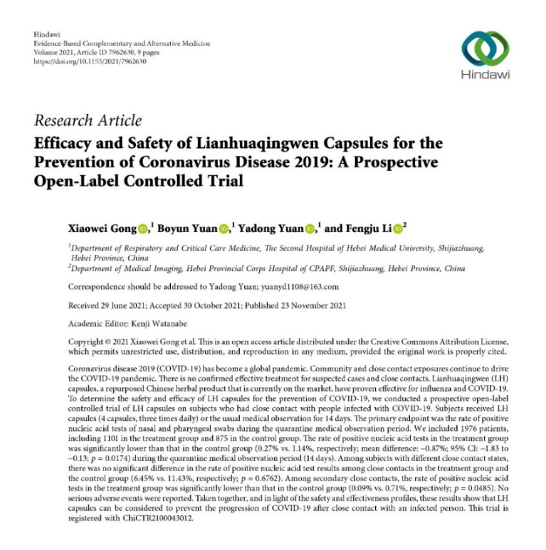 由河北醫(yī)科大學(xué)第二醫(yī)院呼吸與危重癥醫(yī)學(xué)二科主任袁雅冬教授主持開(kāi)展的“連花清瘟膠囊預(yù)防新型冠狀病毒肺炎”真實(shí)世界研究論文被國(guó)際學(xué)術(shù)期刊《循證補(bǔ)充和替代醫(yī)學(xué)》刊發(fā),該研究選取1976例與新冠肺炎感染者有密切接觸的受試者,分為連花清瘟治療組(1101例)和對(duì)照組(875例),兩組受試者分別接受連花清瘟膠囊(4粒/次,3次/天)治療和常規(guī)醫(yī)學(xué)14天觀察,并于14天后檢測(cè)鼻咽拭子核酸檢測(cè)陽(yáng)性率。研究結(jié)果顯示,隔離醫(yī)學(xué)觀察期間(14天)治療組核酸檢測(cè)陽(yáng)性率為0.27%,對(duì)照組為1.14%;二次密切接觸者中,治療組核酸檢測(cè)陽(yáng)性率為0.09%,對(duì)照組為0.71%。服用連花清瘟治療組都顯著低于對(duì)照組。在醫(yī)學(xué)隔離觀察期間,對(duì)于核酸檢測(cè)陽(yáng)性患者,連花清瘟治療組的癥狀發(fā)生率顯著低于對(duì)照組,特別是能顯著降低發(fā)熱的發(fā)生率。這是首個(gè)對(duì)新冠密切接觸者預(yù)防的有效性和安全性的臨床試驗(yàn)。