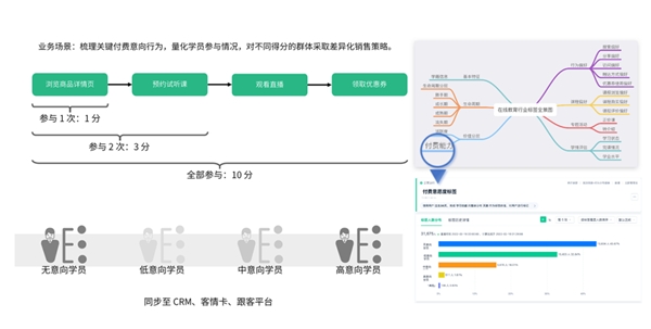 當(dāng)學(xué)員與課程產(chǎn)品交互越多,用戶畫像就會越豐富,班主任對學(xué)員的復(fù)購、進階意向也就掌握得更精準(zhǔn),通過量化學(xué)員關(guān)鍵行為,及時跟進高意向?qū)W員,并對不同群體采取差異化銷售策略,以此提高學(xué)員復(fù)購率。