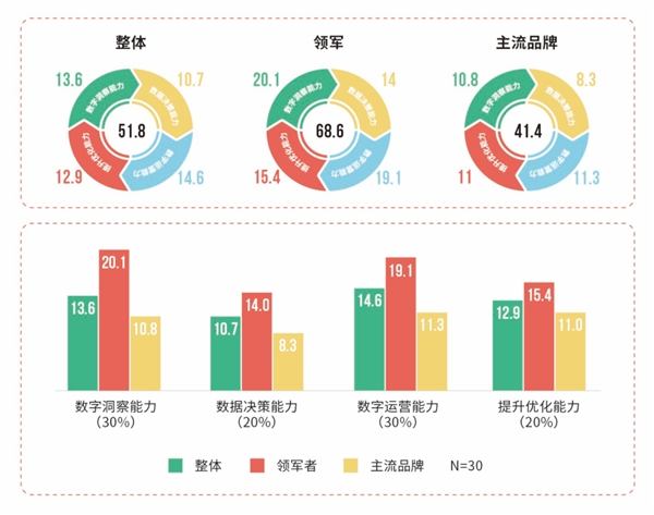 根據(jù)神策數(shù)據(jù)對(duì)新國(guó)貨美妝品牌數(shù)字化運(yùn)營(yíng)成熟度評(píng)估的指標(biāo)解讀發(fā)現(xiàn):國(guó)貨美妝整體數(shù)字化營(yíng)銷能力處于中游水平,各領(lǐng)域均有較大提升空間;領(lǐng)軍者在模型各方面均較領(lǐng)先,其中【數(shù)字洞察能力】和【數(shù)字運(yùn)營(yíng)能力】是關(guān)鍵;主流品牌的數(shù)字化營(yíng)銷能力還偏弱,主要體現(xiàn)在【數(shù)字洞察能力】上的建設(shè)力度不夠。