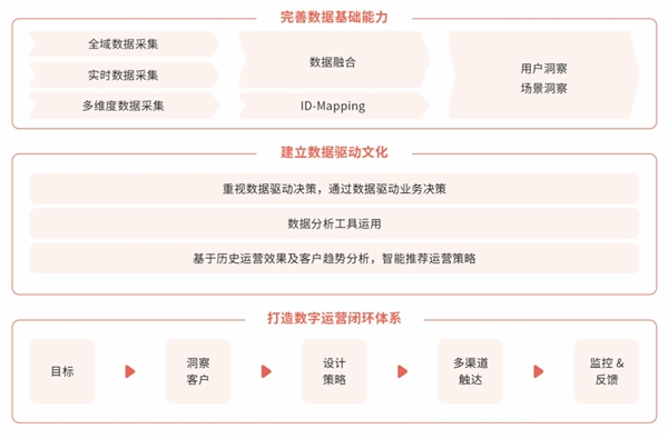 總結(jié)來說,新國(guó)貨美妝品牌在提升數(shù)字化運(yùn)營(yíng)能力上應(yīng)把握三個(gè)關(guān)鍵舉措:完善數(shù)據(jù)基礎(chǔ)能力、建立數(shù)據(jù)驅(qū)動(dòng)文化、打造數(shù)字運(yùn)營(yíng)閉環(huán)體系,如下: