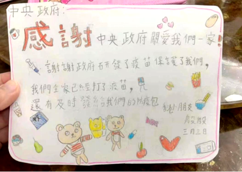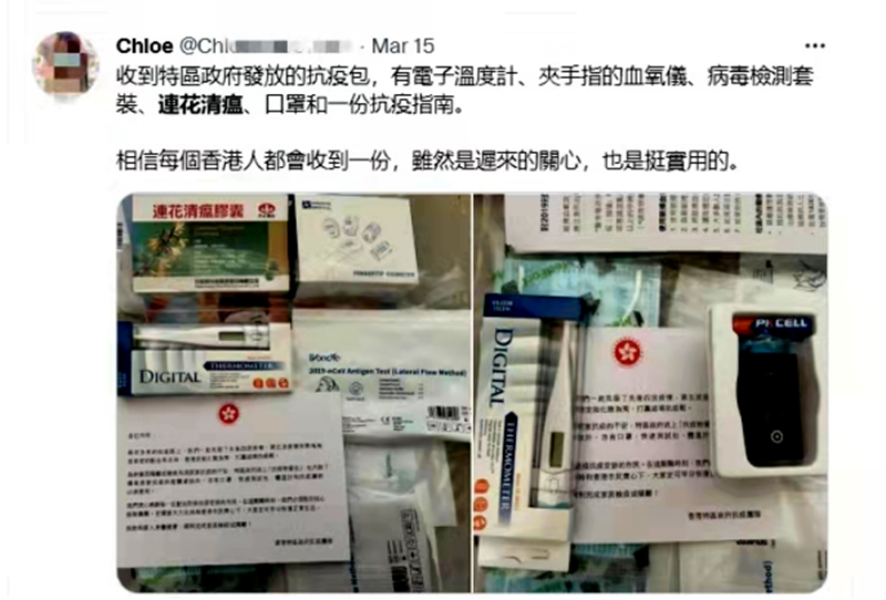 “收到特區(qū)政府發(fā)放的抗疫包,有電子溫度計、夾手指的血氧儀、病毒檢測套裝、連花清瘟膠囊、口罩和一份抗疫指南,挺實用的。”近日,一名居家隔離的香港居民收到政府派發(fā)的“抗疫物資包”后,在社交平臺開心的曬出圖文。更早前,一位叫殷殷的香港小朋友用自己手寫的感謝信,表達了對中央政府為香港市民提供防疫物資的感謝。隨著疫情防控的逐步深入,一個個像這樣滿載關(guān)愛的“抗疫包”越來越快地出現(xiàn)在人們手中。