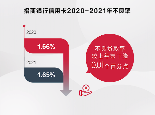 近年來,經(jīng)濟承壓、共債風險、監(jiān)管趨嚴、業(yè)務收緊等因素使信用卡行業(yè)的風險管控面臨較大壓力,但招行信用卡不良率穩(wěn)中有降,風險平穩(wěn)可控。據(jù)財報,2021年,招行信用卡新生成不良貸款292.06億元,同比減少32.35億元,信用卡不良率1.65%,較上年末下降0.01個百分點。