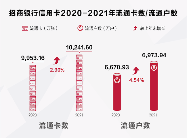 據(jù)財報,截至2021年底,招行信用卡流通卡量10241.6萬張,較上年末增長2.9%,首次突破1億張;流通戶數(shù)6973.94萬戶,較上年末增長4.54%。招行信用卡流通卡量、流通戶數(shù)在高位穩(wěn)步增長,與其從客戶視角出發(fā)推動產(chǎn)品升級,完善豐富的產(chǎn)品矩陣不無關系。