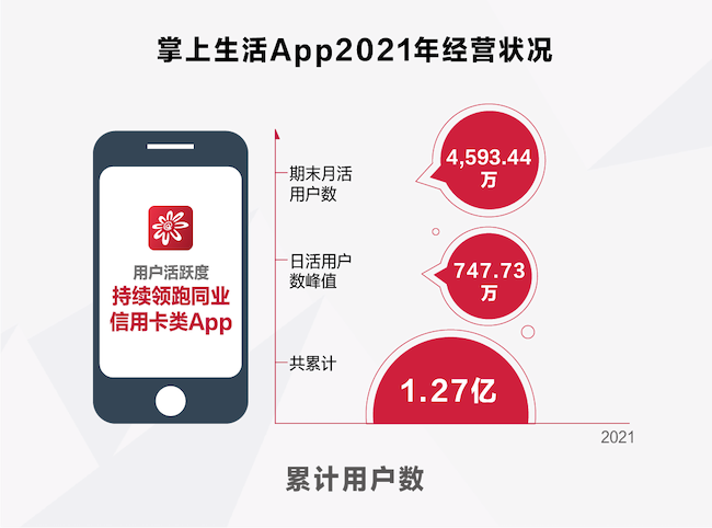 掌上生活App的這些舉措帶來了更高的數(shù)字化獲客水平和用戶增長空間,為優(yōu)化用戶體驗、增強用戶黏性提供了有效路徑。截至2021年底,掌上生活App累計用戶數(shù)1.27億戶,日活躍用戶數(shù)峰值747.73萬戶,期末月活躍用戶數(shù)4593.44萬戶,用戶活躍度居同業(yè)信用卡類App前列。