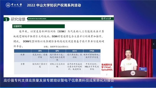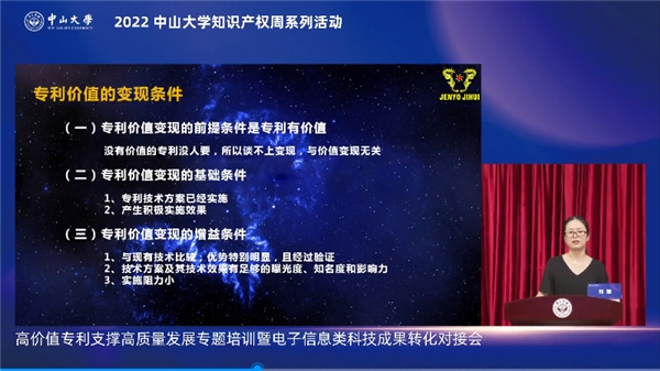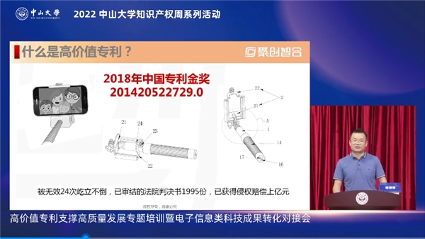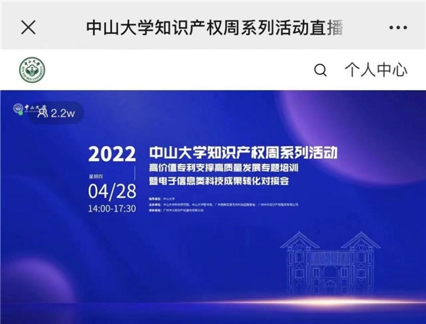 2022年4月28日,在中山大學的全程指導及越秀區(qū)政府的鼎力支持下,中山大學科學研究院、廣州高新區(qū)黃花崗科技園管委會、中山大學圖書館、廣州中大知識產權服務有限公司共同成功主辦中山大學知識產權周系列活動高價值專利支撐高質量發(fā)展專題培訓暨電子信息類科技成果轉化對接會。本次活動采取線上方式開展,邀請兩位業(yè)界專家圍繞高價值專利支撐高質量發(fā)展做專題報告,多達178項電子信息類專利項目與83家企業(yè)進行了精準對接,活動在線人數超2.2萬人,多位知識產權專家及知名企業(yè)在云端匯聚,助力知識產權高質量發(fā)展。