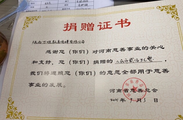 (圖為河南省慈善總會頒發(fā)的捐贈證書)