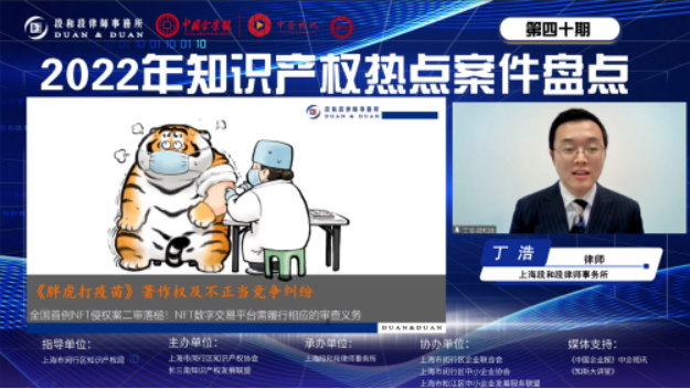 尊重和保護知識產(chǎn)權(quán)方得始終 丁浩盤點并解讀了2022年著作權(quán)及商標熱點案例,重點介紹了全國首例NFT侵權(quán)案:《胖虎打疫苗》著作權(quán)及不正當競爭糾紛、嗶哩嗶哩商標無效行政訴訟、范斯公司(VANS,INC.)與高志龍等侵害商標權(quán)糾紛案和搬酒網(wǎng)不正當競爭糾紛案。