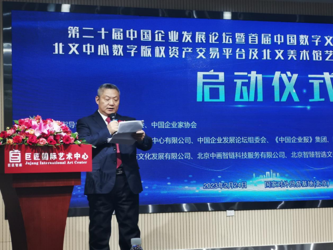 2023年2月24日,第二十屆中國企業(yè)發(fā)展論壇暨首屆中國數(shù)字文化產(chǎn)業(yè)投資高峰論壇啟動(dòng)儀式在國家對外文化貿(mào)易基地(北京)舉行。與此同時(shí),北文美術(shù)館藝術(shù)品交易服務(wù)平臺(tái)、北文中心數(shù)字版權(quán)資產(chǎn)發(fā)行平臺(tái)啟動(dòng)儀式也如期舉辦。