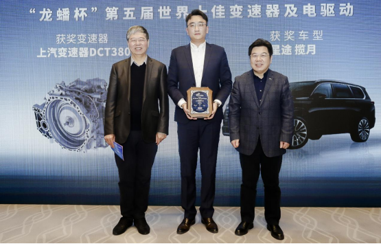 汽車評價(jià)研究院院長李慶文(左1)與中國汽車工業(yè)協(xié)會(huì)副秘書長羅軍民(右1)為上汽變速器市場營銷負(fù)責(zé)人王含東(中)頒獎(jiǎng)
