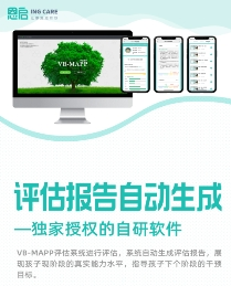 評估環(huán)節(jié) 評估報告自動生成!使用獨家授權(quán)的自研軟件——VB-MAPP評估系統(tǒng)進行評估,系統(tǒng)自動生成評估報告,展現(xiàn)孩子現(xiàn)階段的真實能力水平,指導(dǎo)孩子下個階段的干預(yù)目標(biāo)。