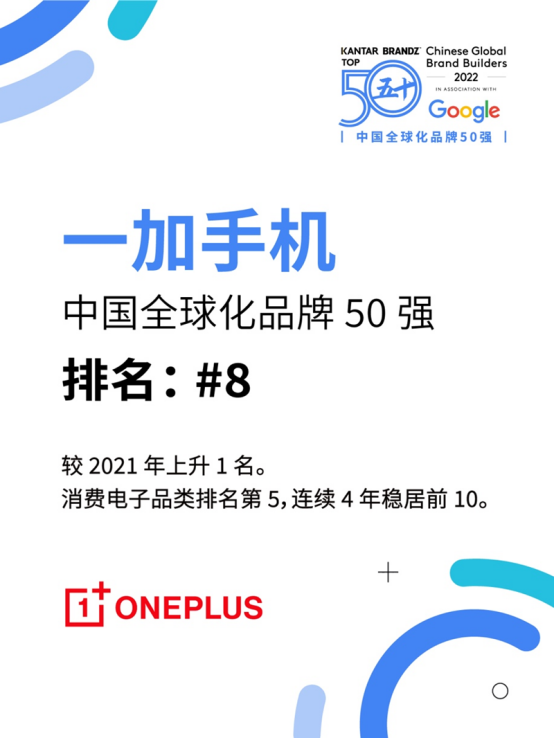 ?中國全球化品牌50強》。其中,一加手機排名第8,同時也在消費電子品類排名第5,總排名相較21年上升1名。憑借優(yōu)質(zhì)的產(chǎn)品體驗和獨特的品牌氣質(zhì),一加手機已連續(xù)6年蟬聯(lián)該榜單,且連續(xù)4年穩(wěn)居前10。