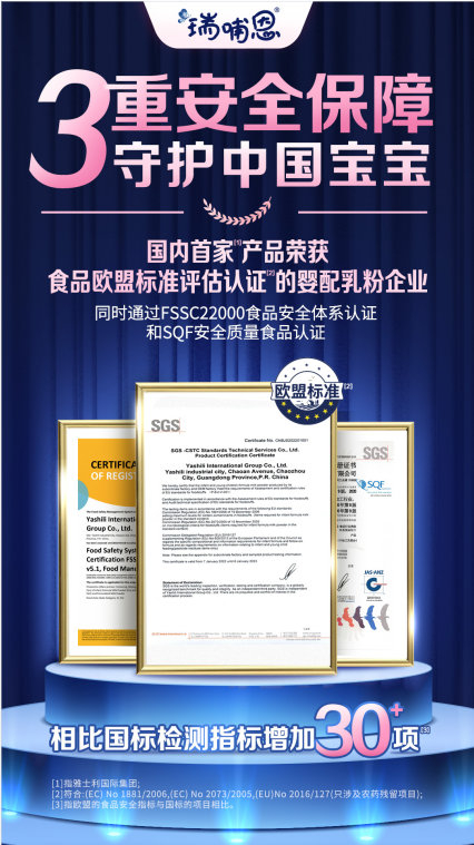 秉承“消費(fèi)者第一第一第一”的企業(yè)價(jià)值觀,蒙牛瑞哺恩對(duì)標(biāo)全球最嚴(yán)標(biāo)準(zhǔn),全面啟動(dòng)歐盟標(biāo)準(zhǔn)升級(jí),憑借著高標(biāo)準(zhǔn)、嚴(yán)要求,瑞哺恩國(guó)內(nèi)4家工廠均順利拿下國(guó)際權(quán)威認(rèn)證機(jī)構(gòu)SGS授予的歐盟食品標(biāo)準(zhǔn)認(rèn)證,蒙牛瑞哺恩更成為國(guó)內(nèi)首款通過(guò)食品歐盟標(biāo)準(zhǔn)評(píng)估認(rèn)證的嬰配乳粉產(chǎn)品,同時(shí)還獲得SGS授予的FSSC2200食品安全體系認(rèn)證和SQF食品安全質(zhì)量認(rèn)證,代表著蒙牛瑞哺恩旗下的嬰幼兒配方奶粉的生產(chǎn)已達(dá)到國(guó)際一流水平。