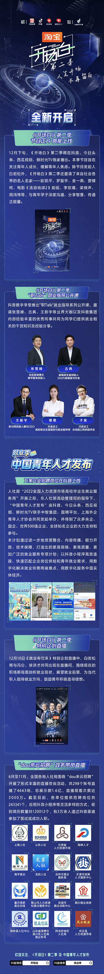 關(guān)注青年成長的同時,抖音也致力于為年輕人提供切實幫助!2022年全國人力資源市場高校畢業(yè)生就業(yè)服務(wù)周開啟之際,在國家人社部流動管理司的指導(dǎo)下,抖音推出“中國青年人才發(fā)布”就業(yè)招聘專區(qū),旨在利用新渠道助力應(yīng)屆畢業(yè)生就業(yè)?!堕_場白》第二季特別企劃直播專場“就業(yè)有位來”也將于12月10日同期上線,為畢業(yè)生就業(yè)提供專業(yè)指導(dǎo)。