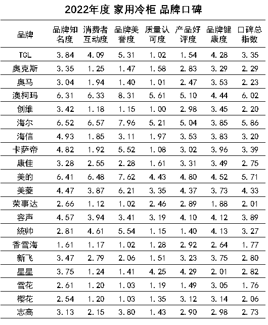 中國品牌口碑指數(shù):實至名歸!2022家用冷柜口碑澳柯瑪奪冠