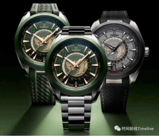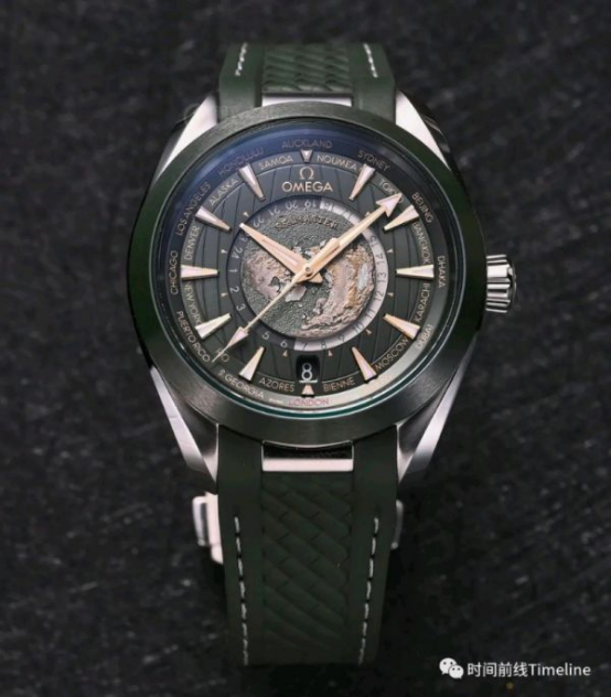 這款世界時的細(xì)節(jié)在于,內(nèi)表盤的海洋顏色與手表配色一致,鈦殼是灰色、鋼殼是綠色;陸地則采用激光技術(shù)進(jìn)行著色,金色是高海拔地區(qū)。其中鈦金屬表盤的黑灰色都是由激光歐米茄的地圖是以北極為中心的北半球,我們可以注意到,地圖帶有微微的弧形效果,模仿了真實的地球曲率。盤面上帶地圖的表不少,但像歐米茄做的這么細(xì)致真實的,極少。