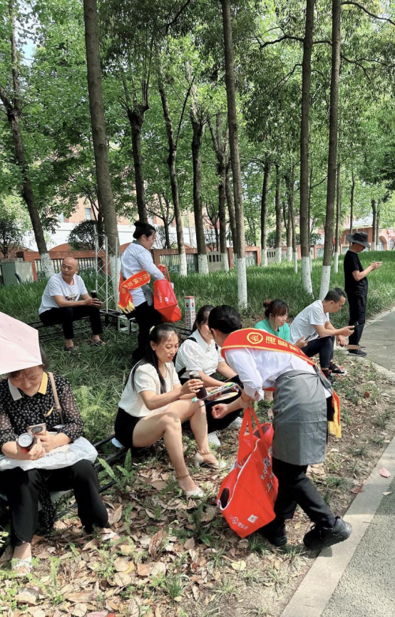 “天氣太熱了,喝點楊梅汁解解暑吧,祝您的孩子馬到功成,前程似錦!”在成都市新都中學高考考點門前,來自海底撈七一廣場店的志愿者員工們向等候的家長送上清涼解暑的飲品和小扇子。