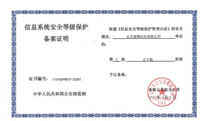而作為全域消費者數(shù)字化運營服務商,我們有責任確??蛻粲脩舻碾[私得到充分的尊重和保護。慧博科技云千載是行業(yè)中同時獲得ISO27001(信息安全管理體系認證證書)與「三級等保」雙重認證的企業(yè)產(chǎn)品,充分體現(xiàn)出慧博科技云千載數(shù)據(jù)中臺系統(tǒng)在用戶信息安全管理方面擁有領先的信息技術水平和安全防護能力。