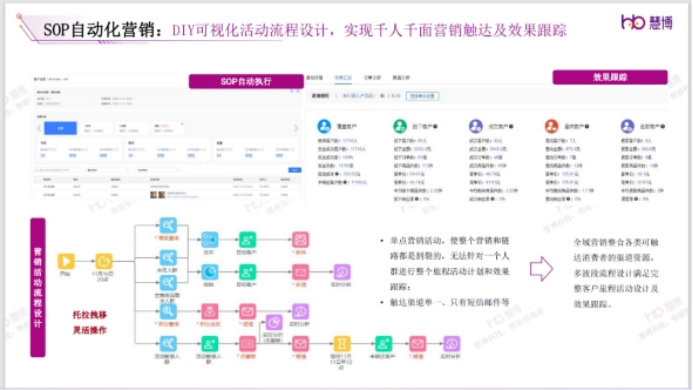 除了實現(xiàn)千人千面營銷觸達及效果跟蹤外,慧博云千載數(shù)據(jù)中臺還可以基于客戶分層,為不同標簽的客戶制定不同的SOP,進行觸達和營銷,提升運營效率。
