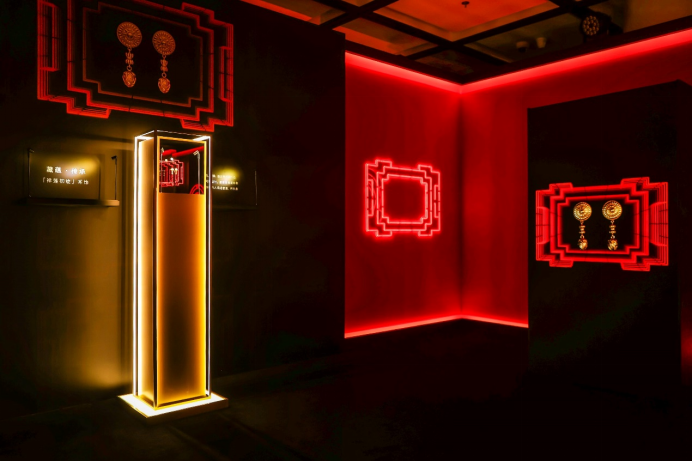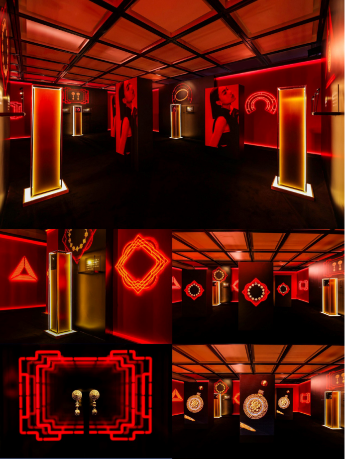 博大精深的中國(guó)傳統(tǒng)文化孕育出無限創(chuàng)造力和想象力,因此周大福珠寶集團(tuán)在探索珠寶美學(xué)與中國(guó)傳統(tǒng)文化相結(jié)合的過程中不斷推陳出新,呈獻(xiàn)許多匠心獨(dú)運(yùn)的藝術(shù)臻品——標(biāo)志性的周大福傳承系列作品。此次GOLD IS CHIC鎏光時(shí)代·周大福傳承系列黃金美學(xué)藝術(shù)展跨越時(shí)空界限,將蘊(yùn)含歷史、文化的黃金美學(xué)呈現(xiàn)到大眾視野中,全方面展現(xiàn)黃金珠寶設(shè)計(jì)背后的時(shí)尚創(chuàng)意靈感、精益求精的工藝和具有東方韻味的藝術(shù)美學(xué)理念。此次展覽的空間設(shè)計(jì)從周大福傳承系列視覺大片中汲取靈感,衍生出紅黑金三色、光影不斷變換、又極富想象力的三個(gè)空間,以創(chuàng)新的藝術(shù)視角展現(xiàn)品牌具有中國(guó)傳統(tǒng)文化內(nèi)涵的時(shí)尚潮流形象。置身于展覽空間,映入眼簾的是霓虹線條與迷離燈光相互交織而成的“時(shí)光隧道”,使人仿佛置身于過去與未來的交界地。光影流動(dòng)的變幻間,映照出品牌歷經(jīng)歲月沉淀后的璀璨輝煌,這意味著品牌正開啟黃金世代的嶄新篇章。