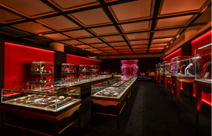 其中,盛世華彩·傳承系列的唐馬套系,以現(xiàn)藏于陜西歷史博物館的唐三彩馬三花馬為原型,采用傳統(tǒng)黃金鑄造、花絲、 鏨刻魚子地等工藝的基礎(chǔ)上,加之藝術(shù)加工與文化創(chuàng)意,再現(xiàn)大唐盛世開放融合的生活之態(tài);從古至今,葫蘆文化有著數(shù)千年的歷史積淀,以其獨(dú)特的歷史淵源在現(xiàn)代文化中占據(jù)重要地位,是中華吉祥文化的代表象征。展柜中陳列著各式各樣的葫蘆作品,不僅僅造型上精心雕琢、美輪美奐,工藝上采用黃金花絲、琺瑯、鏨刻等多重工藝表達(dá)傳統(tǒng)文化的美,也將富貴長(zhǎng)壽、福祿雙全的吉祥祝福寄托于物;“洛陽親友如相問,一片冰心在玉壺”,品牌借由國(guó)玉·傳承系列的玉承萬代和田玉茶具表達(dá)出牽絆著遠(yuǎn)行人的心緒,將品牌對(duì)生活美學(xué)的研究和融入發(fā)揮至極致。