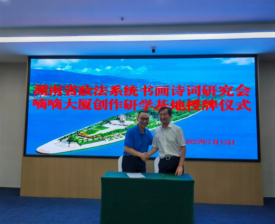 儀式現(xiàn)場(chǎng),陳嶺主席與湖南嘀嘀大酒店董事長(zhǎng)喻熟東簽約,標(biāo)志著“湖南省政法文化嘀嘀大廈創(chuàng)研基地”正式成立。隨后,在眾位嘉賓的共同見(jiàn)證下,彭對(duì)喜、劉慶富、陳嶺、喻熟東為創(chuàng)作研學(xué)基地揭牌。