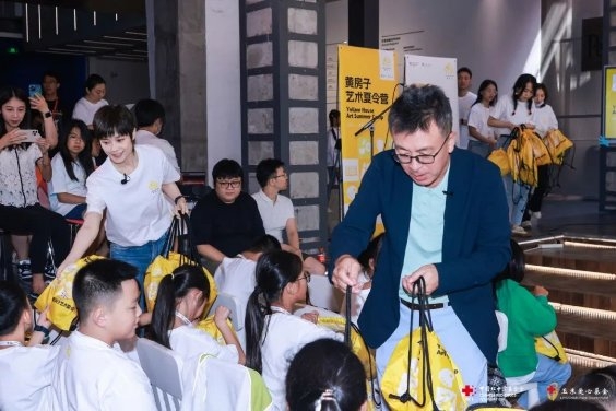 ▲李宇春、劉小東、喻紅向參加夏令營活動(dòng)的師生發(fā)放藝術(shù)夢想包